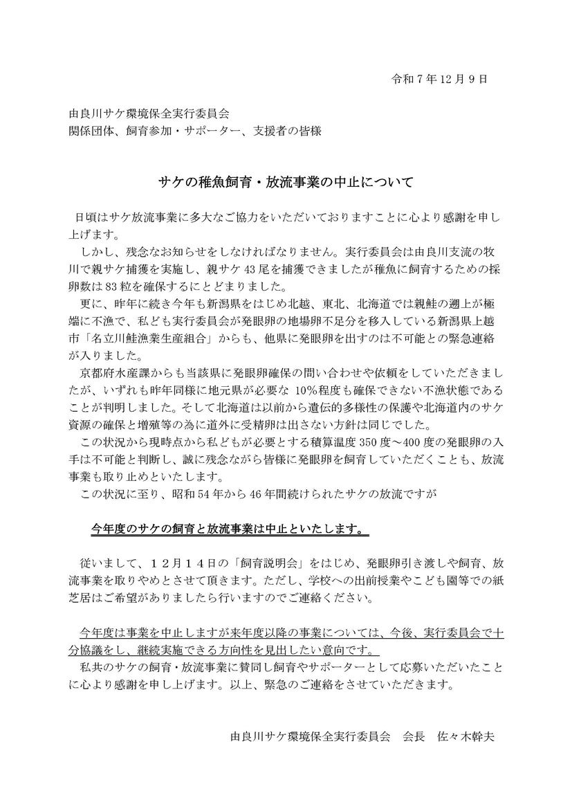 〇今年は発眼卵を配付取りやめにしましたがマスコミの皆さんの「配付断念」の報道も流していただき感謝します。